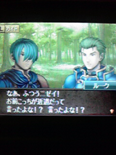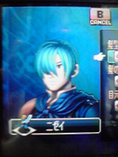【FE新紋章】ぷれい記 げーむぷれい日誌 2011年08月26日 おしごとはそんなに忙しくないんだけど、おしごとのためのおべんきょに忙殺されてる毎日だよ…(´・ω・`)さて、某友人から譲り受けたこちら。そろそろ遊んでみようかと思ったわけだ。ちなみに黒兎さん、FEの知識は蒼炎と暁しかないです。昔スーファミの頃とーちゃんがやってるの横から見てたけど、なんのソフトだったのかは忘れました(´・ω・`)なので、FE予備知識はほとんどありません。あと前作である暗黒竜/新暗黒竜もやってないので、マルスさんが何した人なのかとかも知りません(`・ω・´)そんな感じで始めるんだぜ! しかし黒兎さん、目標がないとどうにもRPGができない。そこで2つほど考えてみた。①ドーガさん SFCかなぁ…昔どれだかのシリーズやったときに出会って以来、 妙に忘れられないキャラクター。 アーマーナイトのおっさんだった気がする。 今でも我が家ではアーマーナイト見ると「ドーガ!」って叫ぶくせがあるくらい、 なんだか存在感のあるキャラ。 全然覚えてないので、とりあえず会いたい。 そんな感じ。②ナバールさん 蒼炎でツイハークにものっそいハマった身としては、 とりあえず初代キルソード剣士にも会っておかなければ!という所。 なんだか長髪美形クールの変態って聞いた記憶がある。 一体どんなキャラなんだ…この2つを目標にとりあえずは頑張る。しかしこの2つ達成するまでに次の目的が見つからなければそのまま終了さ!とりあえず電源を入れて見る。なるほど、マルスじゃなくて、この「語られなかった人物」がメインになるわけですね。ノーマルモード+クラシックモードで始めるよーやっぱFEは死亡リセットしないとね!■■アンナさんお久しぶりー!蒼炎と暁でしか合ったこと無いんだけど、こちらのアンナさんはなんだか丸くてかわゆいvおお、ここでキャラ設定。名前、性別、職業に加え、髪型、髪の色、目元が選べるそうで。普段ならここでものっそ悩むところなんだけど、今回はちょっと違う。なぜなら!すでに!某さんにあの髪型があることをお聞きしているわけで!!!ということで青髪前髪長めの男剣士でお願いします。(髪型:11、髪の色:10、目元:3)名前はいつも通りユアンかシーカーにしようかと思ったんだけど、今回はなんとなく「ニゼイ」君になりました。農村の出で賢さが自慢、いずれは隠遁生活を迎えたい、そんな青年です。…どんなだ。本当は金髪か白髪の貴族にしたかったんだけど、男長髪ねえじゃんか…orzストレート長髪の真ッ金髪で貴族美形博愛主義者騎士にしたかったのに!しかし剣士って使えんのか…?やっつけ負けする気しかしないけど、剣士以外を愛せる気がしない。と思ったところではたと気付く。あれ、これ剣士じゃなくね? 「 傭 兵 」 じ ゃ ね ?…おおぃいいい!!剣士にさせろよ!!俺がなりたいのはソードマスターなんだよ!ヤマトなんだよ!傭兵かよ…orzうう、でも辺境の村出身っぽくて良いか…しょぼん。うちの子はこんな感じで…あ間違えた、某ちゃんから頂いたやつだった、これ。こっちです。違い?そんなの服くらい!ああ画質悪い。セーブデータが3ついっぱいだったので、すまんが、最初の持ち主であろう「キヨミ」さんには消えて頂くことにした。さらばだキヨミ。■■■■■■前日1話目。ふむむ、急に色々キャラが出てきてわけわかめになりそうな予感だが、とりあえずロディさんは好みの予感。「私」な冷静さん!騎士かね?こいつらが紋章の赤緑?カタリナちゃんはヒロインか?おっとと、戦闘マップにはキャラの髪の色とか反映されないのか(´・ω・`)うーん、どれがどのキャラだかわからなくなりそうだ。せっかくの青髪なのになぁ。戦闘画面の方では反映されてて良かったーぬるぬる動くwwしかし衣装のダサさ…さすが初期レベル。テラ二の腕ムキムキじゃないっすか!もっと細身がいいのに!職業「傭兵」だからしかたないのか…そいや、傭兵はクラスチェンジしたらなんになるんだ…?勇者?お、せっかくの手槍を有効活用しないジェイガンさん。さすがノーマルモード。メモ---------------------・ニゼイ:Lv2:HP、技、守備、速さ+1 4つ上がると嬉しいね!特に守備あざーっす!-------------------------マルス様はやっぱりカチューシャが気になるなぁ。■■■■前日2話目。あら、ライアンくんかわいい。前髪ぱっつん!ルークもいいやつだなー。何となく小西ボイスで台詞が再生される。っていうか馬の動きいいな!かわいいかわいい。戻るときの動きが好き。ルークはニゼイ、ロディはライアンのおいしい経験値となりました!なかま、だいじ!メモ---------------------・ニゼイ:Lv3:HP、幸運+1 ありゃりゃ、ダメ成長…今後に期待か。-------------------------カタリナちゃんは戦ってくれないの?序盤はひとりでも味方が多いほうが嬉しいのに!ほほう、ライアンくんには兄ちゃんがいる…と。メモメモ。ルークから「ふつうニゼイ」という異名をもらったよ!異常なほどに嬉しくないわけだがなんだこれ!やめろ